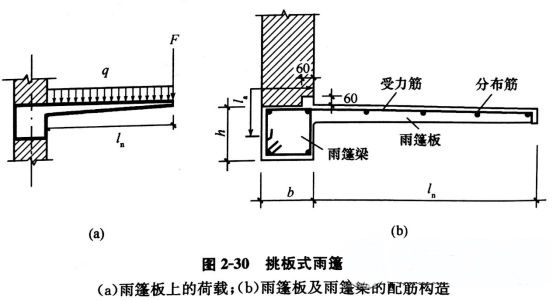 2、雨篷板。雨篷板為一典型懸臂受彎構(gòu)件。雨篷板承受的荷載除有恒載(板自重、面層、抹灰等構(gòu)造層重)、均布活荷載外,還應(yīng)考慮施工荷載或檢修的集中荷載,見上圖(a)。
